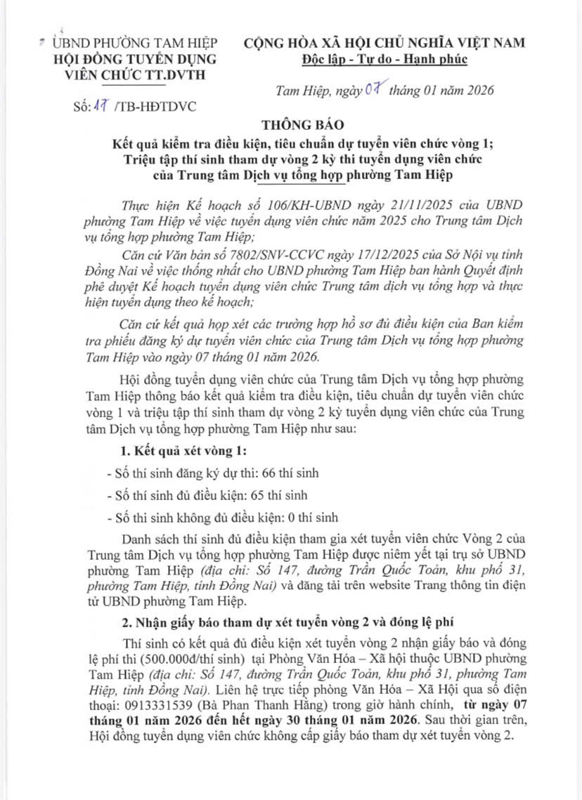 UBND phường Tam Hiệp thông báo Kết quả kiểm tra điều kiện, tiêu chuẩn dự tuyển viên chức vòng 1; Triệu tập thí sinh tham dự vòng 2 kỳ thi tuyến dụng viên chức của Trung tâm Dịch vụ tổng hợp phường Tam...