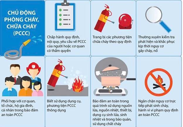Chủ động phòng ngừa và kiểm tra an toàn: Thường xuyên tự tổ chức kiểm tra an toàn PCCC&CNCH tại cơ quan, đơn vị, hộ gia đình và nơi kinh doanh. Kịp thời phát hiện và khắc phục ngay những sơ hở, thiếu sót về PCCC. Trang bị đầy đủ các phương tiện PCCC&CNCH cần thiết để có thể xử lý tại chỗ khi có sự cố.