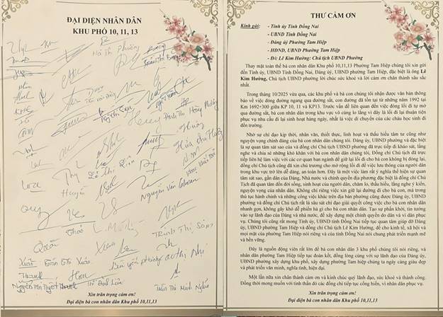 Vừa qua, tập thể bà con nhân dân tại các khu phố 10, 11 và 13 thuộc phường Tam Hiệp đã đồng lòng gửi bức tâm thư cảm ơn sâu sắc đến lãnh đạo Tỉnh ủy, UBND tỉnh Đồng Nai và đặc biệt là người đứng đầu chính quyền phường Tam Hiệp. Đây là minh chứng rõ nét cho sự tín nhiệm và tình cảm yêu mến của nhân dân dành cho những cán bộ "nói đi đôi với làm".