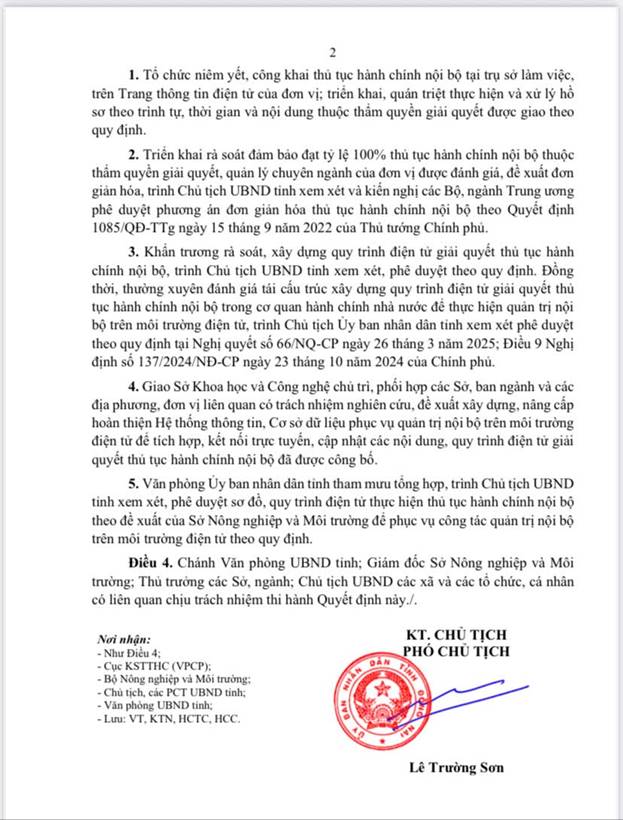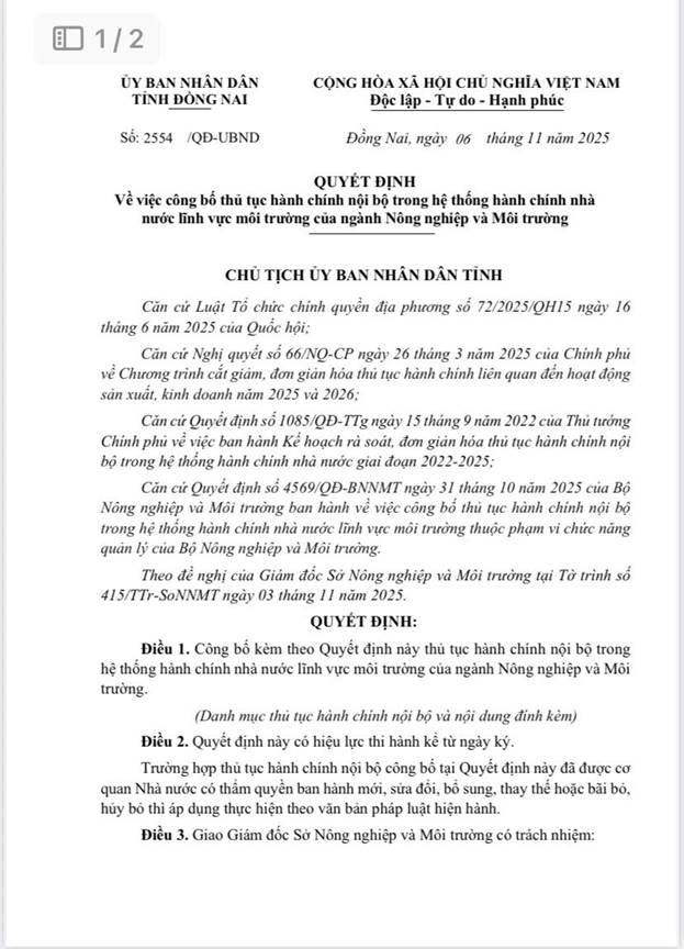 UBND tỉnh Đồng Nai ban hành Quyết định về việc công bố thủ tục hành chính nội bộ trong hệ thống hành chính nhà nước lĩnh vực môi trường của ngành Nông nghiệp và Môi trường