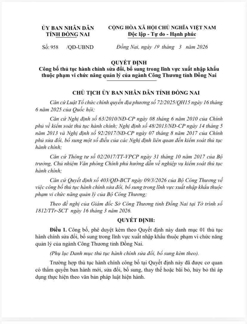 UBND tỉnh Đồng Nai ban hành Quyết định số 958/QĐ-UBND ngày 19/3/2026 Công bố thủ tục hành chính sửa đổi, bổ sung trong lĩnh vực xuất nhập khẩu thuộc phạm vi chức năng quản lý của ngành Công Thương tỉnh Đồng Nai.