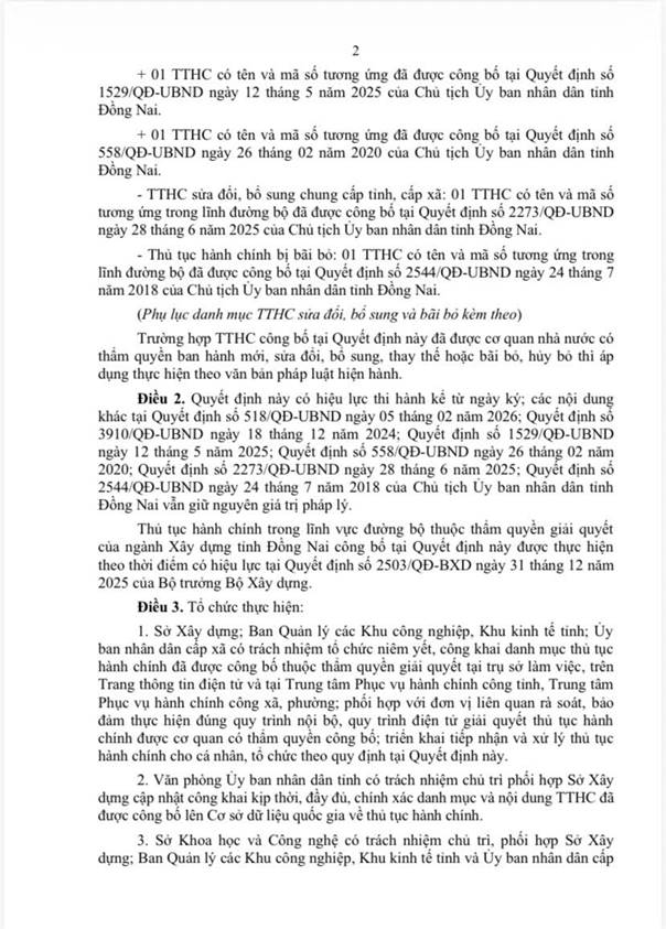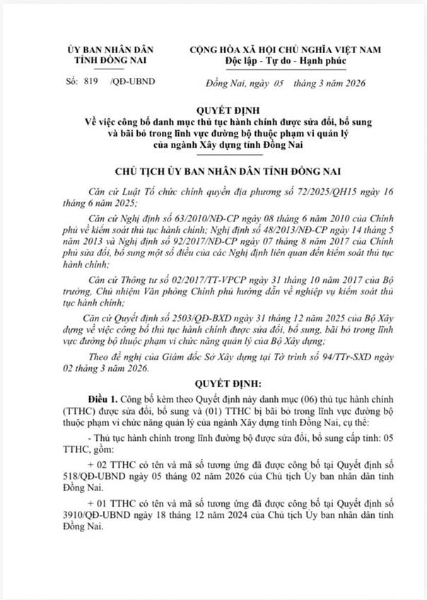 Ủy ban nhân dân tỉnh Đồng Nai ban hành Quyết định số 852/QĐ-UBND ngày 09/03/2026 về việc công bố danh mục thủ tục hành chính được sửa đổi, bổ sung và bãi bỏ trong lĩnh vực đường bộ thuộc phạm vi quản lý của ngành Xây dựng tỉnh Đồng Nai