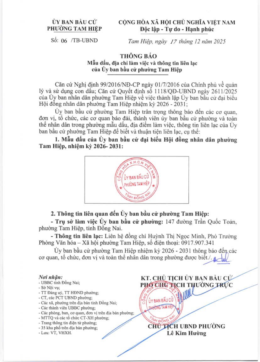 Thông báo Mẫu dấu, địa chỉ làm việc và thông tin liên lạc Ủy Ban bâu cử phường Tam Hiệp
