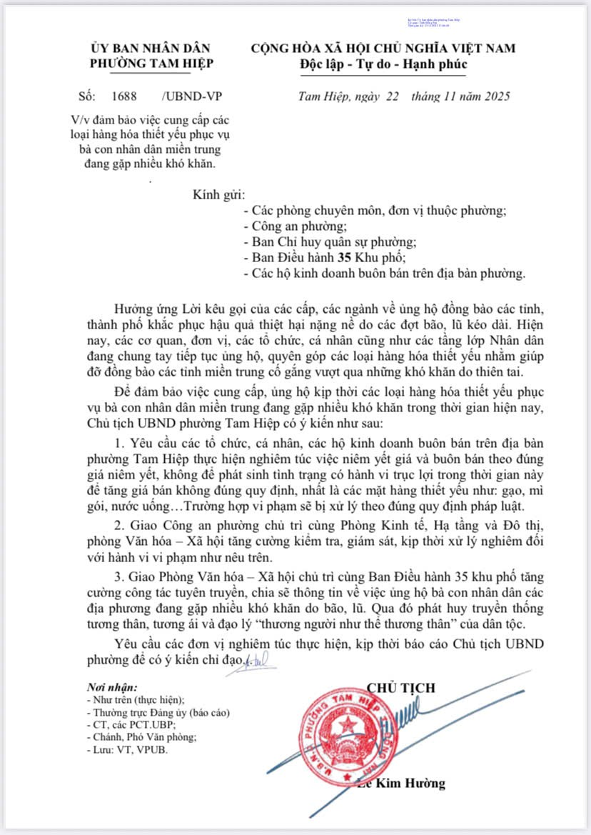 UBND phường Tam Hiệp hưởng ứng Lời kêu gọi của các cấp, các ngành về ủng hộ đồng bào các tỉnh, thành phố khắc phục hậu quả thiệt hại nặng nề do các đợt bão, lũ kéo dài. Hiện nay, các cơ quan, đơn vị, các tổ chức, cá nhân cũng như các tầng lớp Nhân dân đang chung tay tiếp tục ủng hộ, quyên góp các loại hàng hóa thiết yếu nhằm giúp đỡ đồng bào các tỉnh miền trung cố gắng vượt qua những khó khăn do thiên tai.