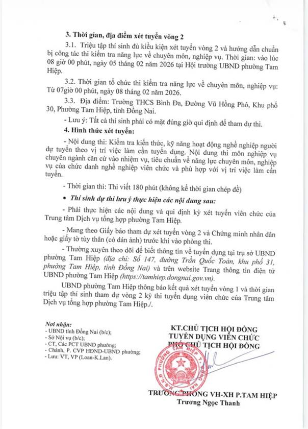 UBND phường Tam Hiệp thông báo Kết quả kiểm tra điều kiện, tiêu chuẩn dự tuyển viên chức vòng 1; Triệu tập thí sinh tham dự vòng 2 kỳ thi tuyến dụng viên chức của Trung tâm Dịch vụ tổng hợp phường Tam Hiệp