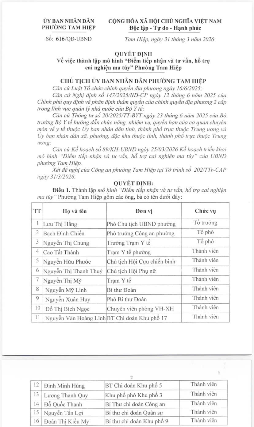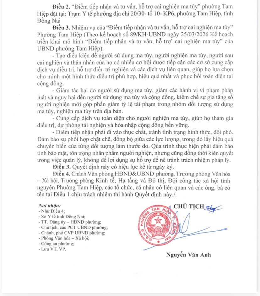 Ủy ban Nhân dân phường Tam Hiệp ban hành Quyết định về việc thành lập mô hình "điểm tiếp nhận và tư vấn, hỗ trợ cai nghiện ma túy"
