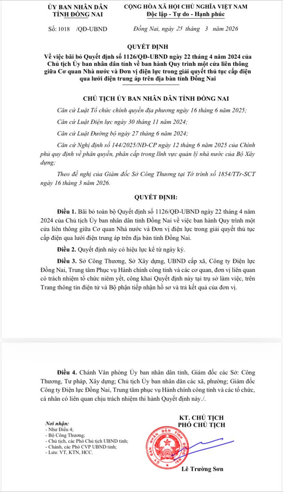 Ủy ban nhân dân tỉnh Đồng Nai ban hành Quyết định số 1018/QĐ-UBND ngày 25/3/2026 Về việc bãi bỏ Quyết định số 1126/QĐ-UBND ngày 22 tháng 4 năm 2024 của Chủ tịch Ủy ban nhân dân tỉnh về ban hành Quy trình một cửa liên thông giữa Cơ quan Nhà nước và Đơn vị điện lực trong giải quyết thủ tục cấp điện qua lưới điện trung áp trên địa bàn tỉnh Đồng Nai.