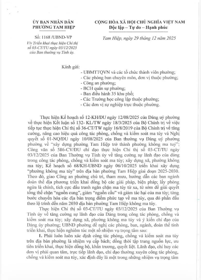 <strong>UBND PHƯỜNG TAM HIỆP TRIỂN KHAI THỰC HIỆN CHỈ THỊ 03-CT/TU NGÀY 03/12/2025 CỦA BAN THƯỜNG VỤ TỈNH ỦY</strong><br />