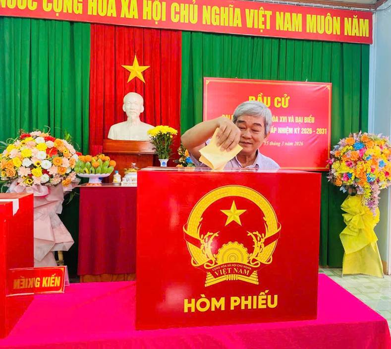 Tại điểm bỏ phiếu trong hình, một cử tri cao tuổi đang thành tâm gửi gắm lá phiếu của mình vào hòm phiếu được trang trí trang trọng với biểu tượng Quốc huy. Nụ cười rạng rỡ của ông là minh chứng cho niềm tin vào những đại biểu đủ đức, đủ tài, có thể đại diện cho tiếng nói và nguyện vọng của nhân dân.