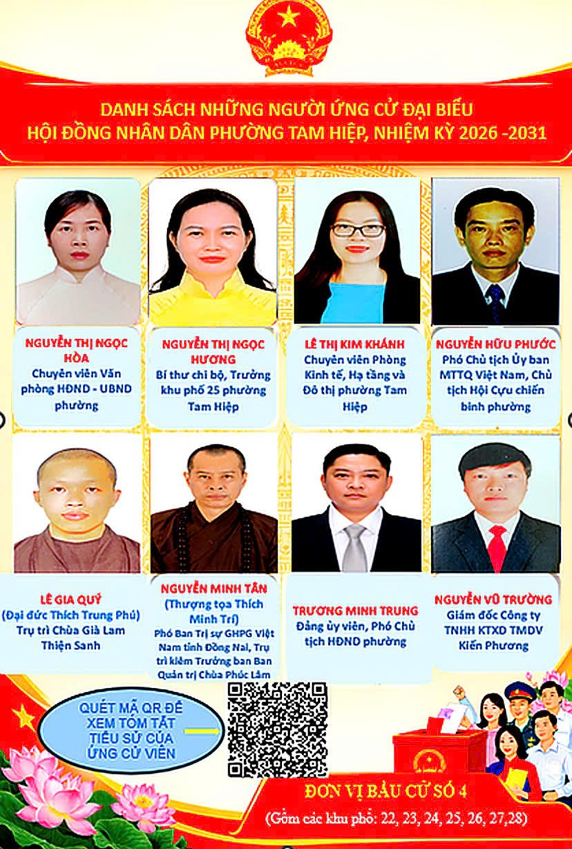 Danh sách những người ứng cử Hội đồng Nhân dân phường Tam Hiệp, nhiệm kỳ 2026 - 2031 - Đơn vị bầu cử số 4