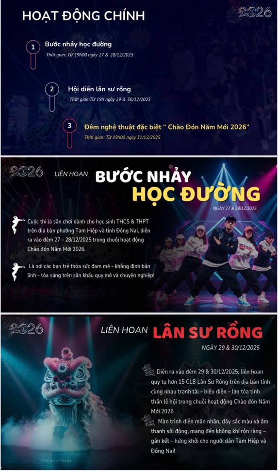 Đêm giao thừa 31/12 tại công viên Dương Tử Giang, phường Tam Hiệp sẽ tổ chức chương trình đại nhạc hội với sự xuất hiện ca sĩ khách mời DJ Trang Moon, Hoàng Yến Chibi, Jey B...Sân khấu lớn với nhiều hiệu ứng LED đặc biệt, dự là hoành tráng lắm nha.